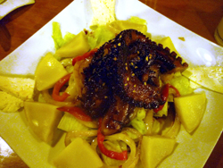 Mientras se pueda y el presupuesto lo permita, me puedo dar el gusto de probar platos que no pensaba comer, como este guiso de pulpo glaseado acompañado con corazón de alcachofa; lamentablemente el romanticismo de la luces alteró la coloración del potaje marino, pero aún así me di el gusto de robarle unas imágenes antes de ser digerido.